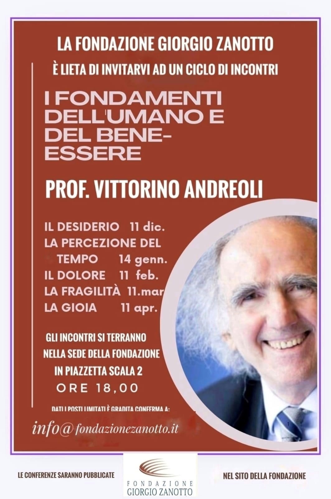 La Fondazione Giorgio Zanotto è lieta di invitarvi ad un ciclo di incontri con il Professor Vittorino Andreoli.